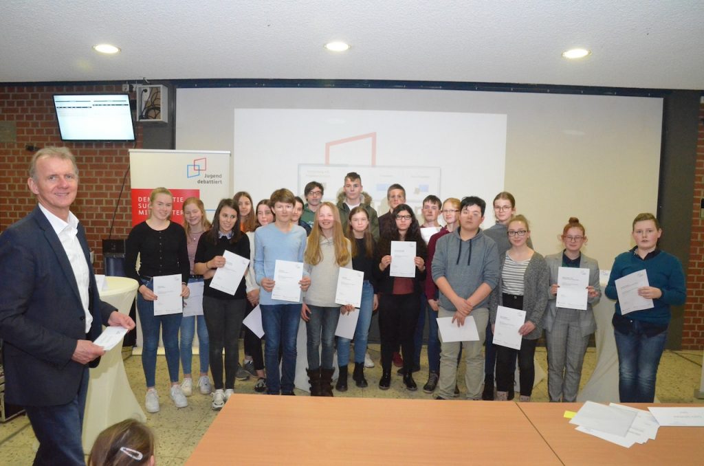 Die Jugend debattiert-Gruppe unserer Schule bestehend aus den Wettbewerbsteilnehmern Alexander Rohe (Klasse 9a, Platz 13), Niels Hradek (EF, Platz 6), Janik Schuster (EF, Platz 13) und Robin Schmitz (9a) jubelte ausgelassen im Kreise der Betreuer und Juroren, die sich in diesem Jahr aus den beiden Ehemaligen Kathrin Rau (Abitur 2018) und Lukas Penner (Abitur 2012) sowie Frau Knie, Herr Posch und Herr Klemm zusammensetzte.