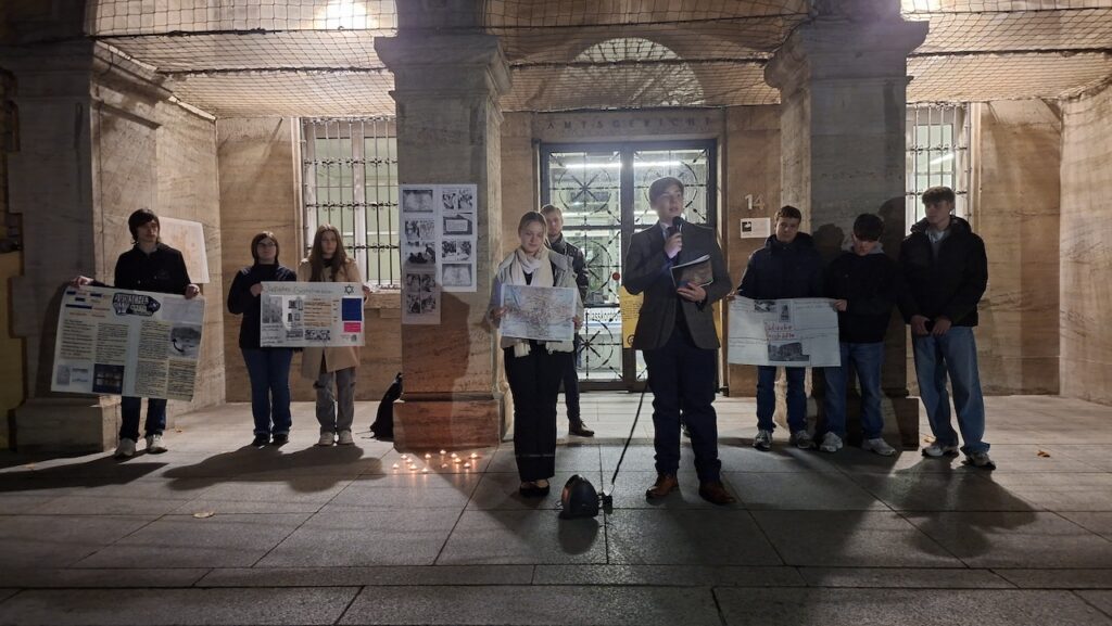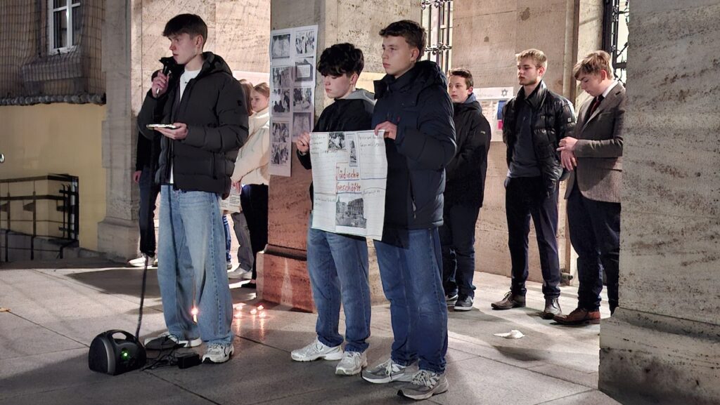 Sie wiesen darauf hin, wie wichtig es ist, dass die Erinnerung an die Verbrechen des Nationalsozialismus lebendig bleibt. Gerade in einer Zeit, in der antisemitische Parolen, Hass und Ausgrenzung wieder lauter werden, ist es entscheidend, antisemitische Ausgrenzung und Anfeindungen, damals wie heute, nicht unbeachtet zu lassen. So wurde aus der Mahnwache nicht nur ein stilles Gedenken, sondern auch ein Austausch darüber, was diese Geschichte für uns heute bedeutet. Umso bewegender war es für uns, dass der offizielle Israel-Account (@stateofisrael) unsere Mahnwache repostet und damit unsere Arbeit sichtbar gemacht hat.