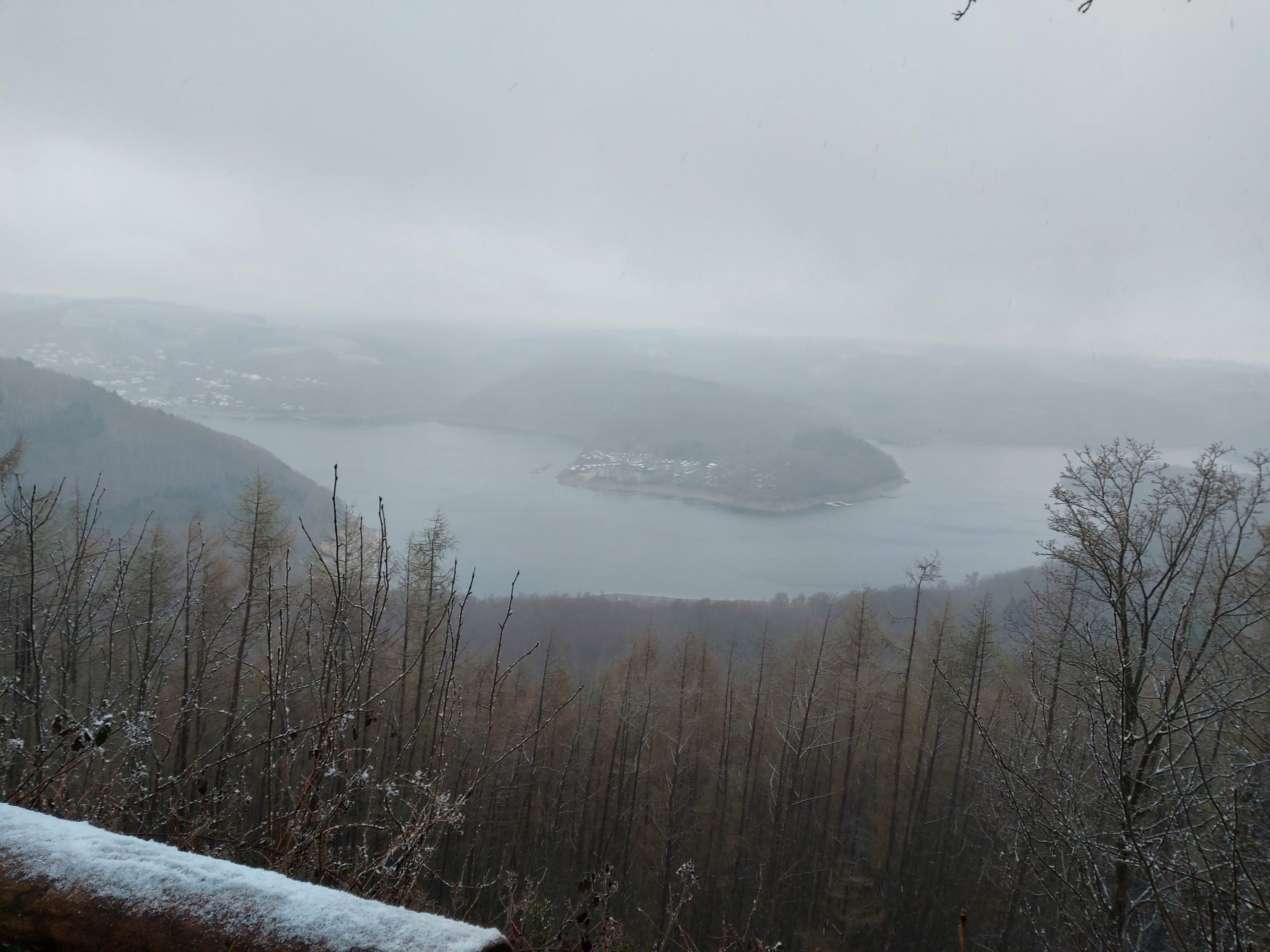 Der Weg zum Aussichtspunkt Hirschley führte uns dann durch naturnahe Buchenwälder. Am Aussichtspunkt konnten wir über die Rurtalsperre bis nach Schmidt und Woffelsbach blicken. Der Rückweg führte uns dann über den Höhenzug des Kermeter wieder zu unserem Ausgangspunkt an der Bushaltestelle. Die Unterschiede zwischen Kiefern und Tannen, aber auch der Unterwuchs des Buchenwaldes konnten auf dem Wege noch vertieft werden. Nach über dreistündiger intensiver Arbeit am außerschulischen Lernort ging es dann so langsam wieder nach Hause. Die Kälte hatte inzwischen wohl alle durchdrungen und man erwartete ab 12.30 Uhr unseren Mietbus sehnsüchtig zurück. Die Rückfahrt war dann warm und kurzweilig.
