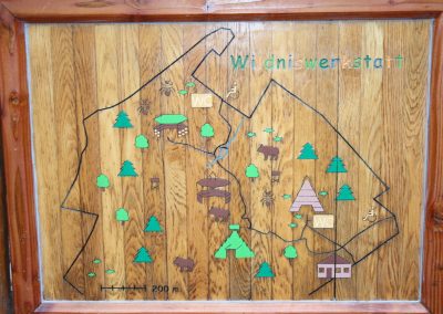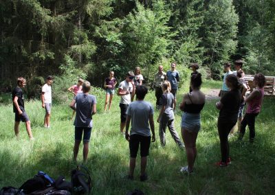 Natürlich durften auch die üblichen Vertrauensspiele, wie das Fallen in ein Spalier der Mitschüler, Reh und Jäger mit Fernrohr vom Hochsitz aus, die Überwindung einer mehrere Meter hohen Holzwand, aber auch das Lauschen auf schleichende Lebewesen und das Zuordnen mit dem Wasserspender, nicht fehlen. In der Mittagspause konnte man in Hängematten den Geräuschen des Waldes lauschen oder Holz mit dem Messer gestalten.