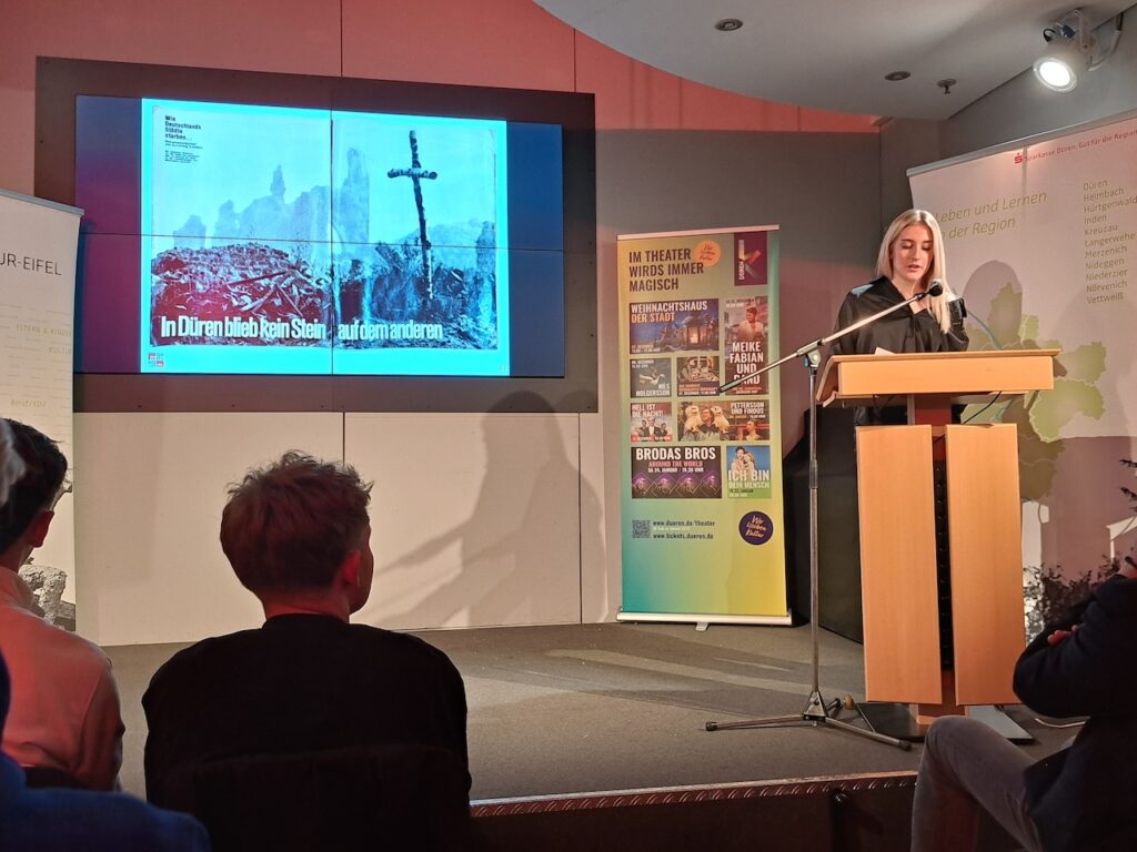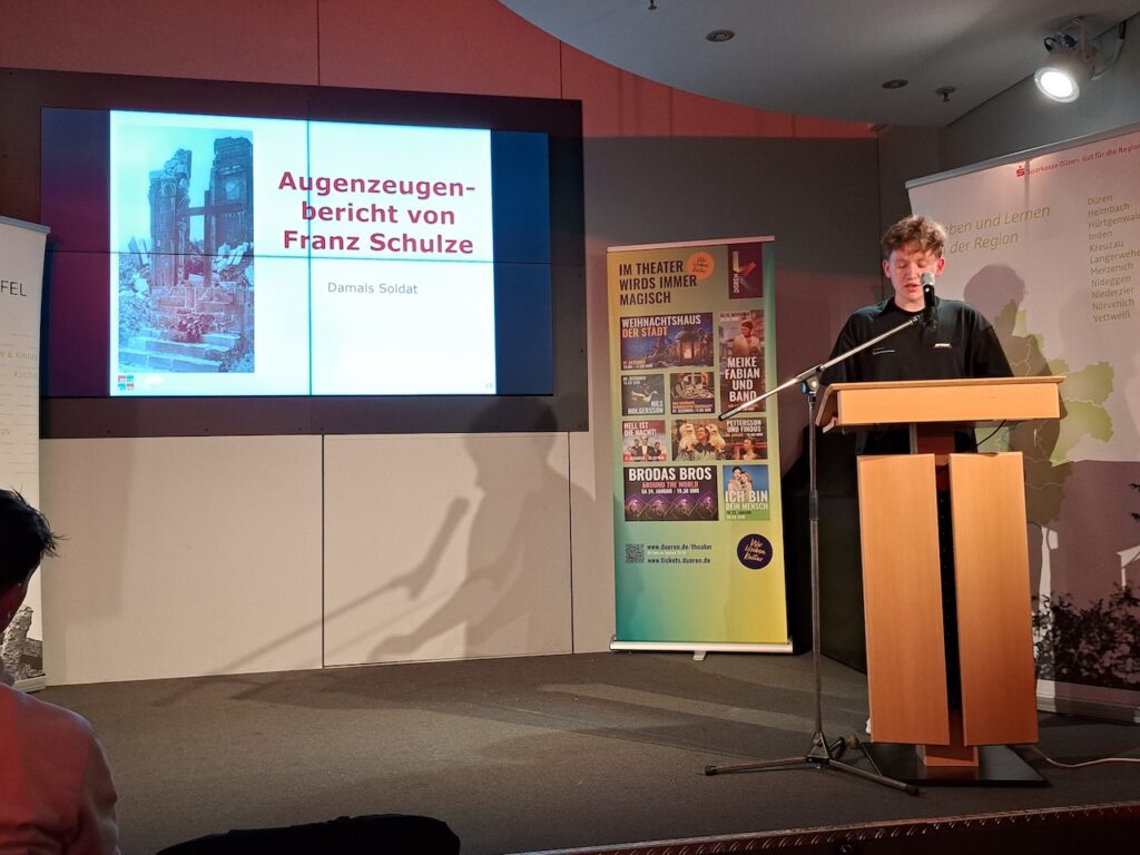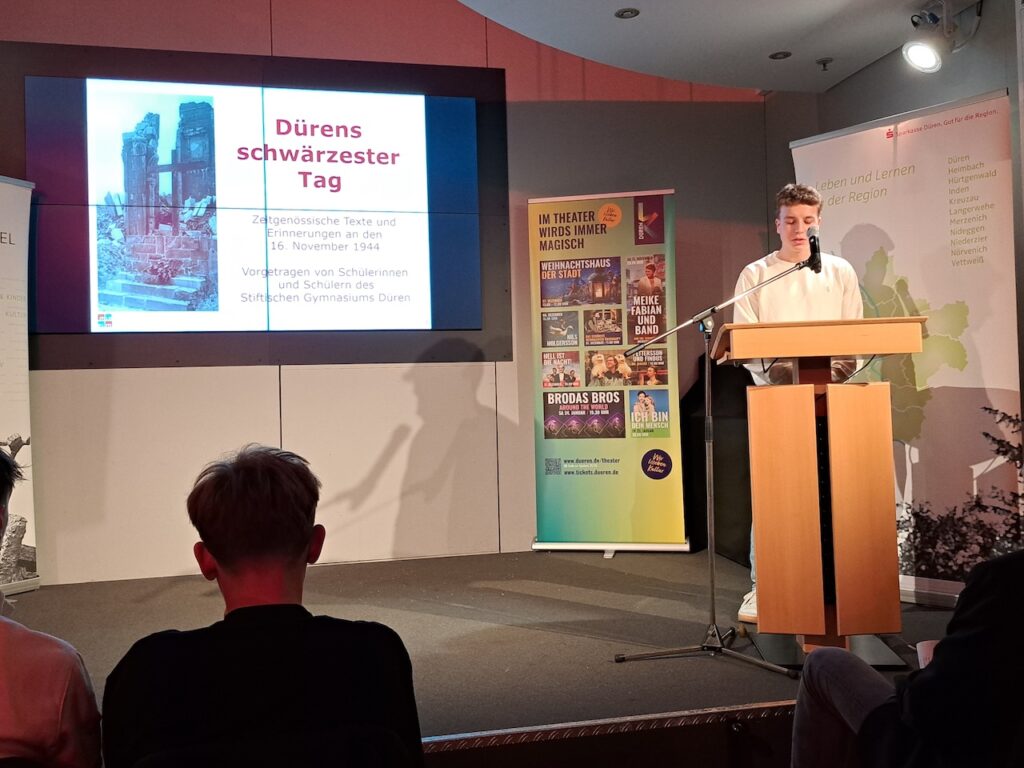 Aus diesem Anlass lasen am 13. November Schülerinnen und Schüler des Leistungskurses Geschichte der Jahrgangsstufe Q1 von Herrn Klemm, in Kooperation mit der VHS Rureifel und dem Stadtmuseum Düren, Zeitzeugenberichte von Personen, die diesen Angriff überlebten. Mit mehr als 3.000 Opfern zählt er zu einem der unvergesslichen Ereignisse in der Historie Dürens.