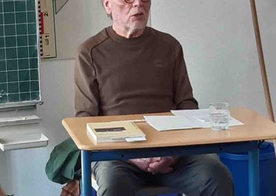 Der Zeitzeuge informierte am 18. Januar 2023 Schülerinnen und Schüler sowie Lehrkräfte über das Leben in DDR und die Verfolgung durch die Staatssicherheit. Peter Hippe freute sich am Ende des langen Tages sichtlich über das von Herrn Klemm stellvertretend für die Fachschaft Geschichte überreichte Exemplar der Schulgeschichte des Stiftischen Gymnasiums, das er als Präsent für seinen Vortrag vor den Lehrerinnen und Lehrern der Fachschaft erhielt.