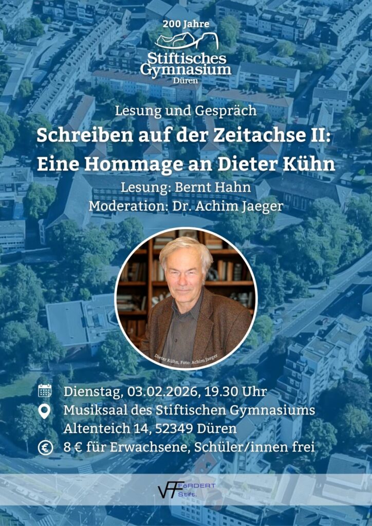 Es war eine besondere Zeitreise für die Zuhörer, die sich am 3. Februar 2026 im Musiksaal versammelt hatten, um der Hommage an Dieter Kühn beizuwohnen, mit der die Reihe „Lesung und Gespräch“ im Rahmen des Jubiläumsprogramms zur 200-Jahrfeier des Stiftischen Gymnasiums fortgesetzt wurde. 1955 hatte Dieter Kühn, der 1935 in Köln geboren wurde und 2015 in Brühl starb, am Stift sein Abitur gemacht und damals angegeben, Journalist werden zu wollen. Nach dem Studium der Germanistik und der Anglistik, das er in Bonn mit seiner Promotion abschloss, entschloss er sich dazu, freier Schriftsteller zu werden.