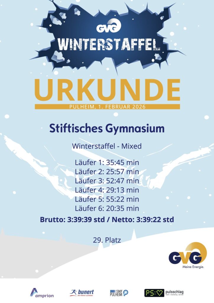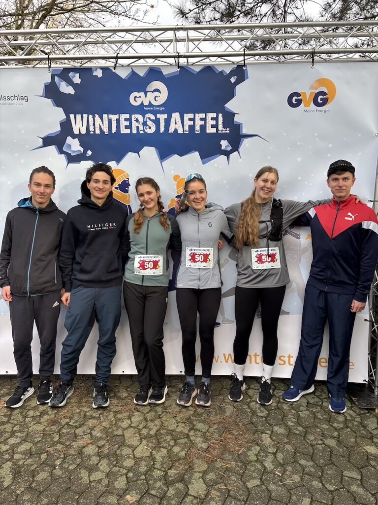 Erstmals trat eine Staffel bestehend aus Schülerinnen und Schülern der Oberstufe bei der Winterstaffel in Pulheim an, um gemeinsam in einer gemischten Staffel einen Marathon zu absolvieren. Die Teilnahme wurde von Sportlehrer Marcel Klemm angeregt, aber alles Weitere organisierte die Mannschaft um Teamkapitän Elias Hoyer (Q1) eigenständig. Das Startgeld übernahm netterweise der Förderverein unserer Schule.