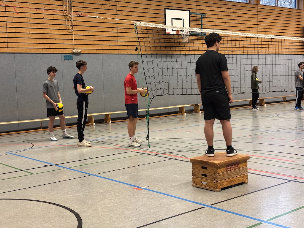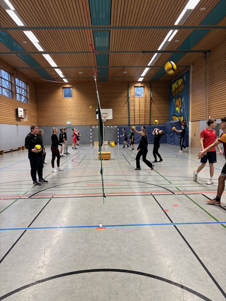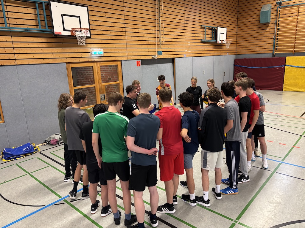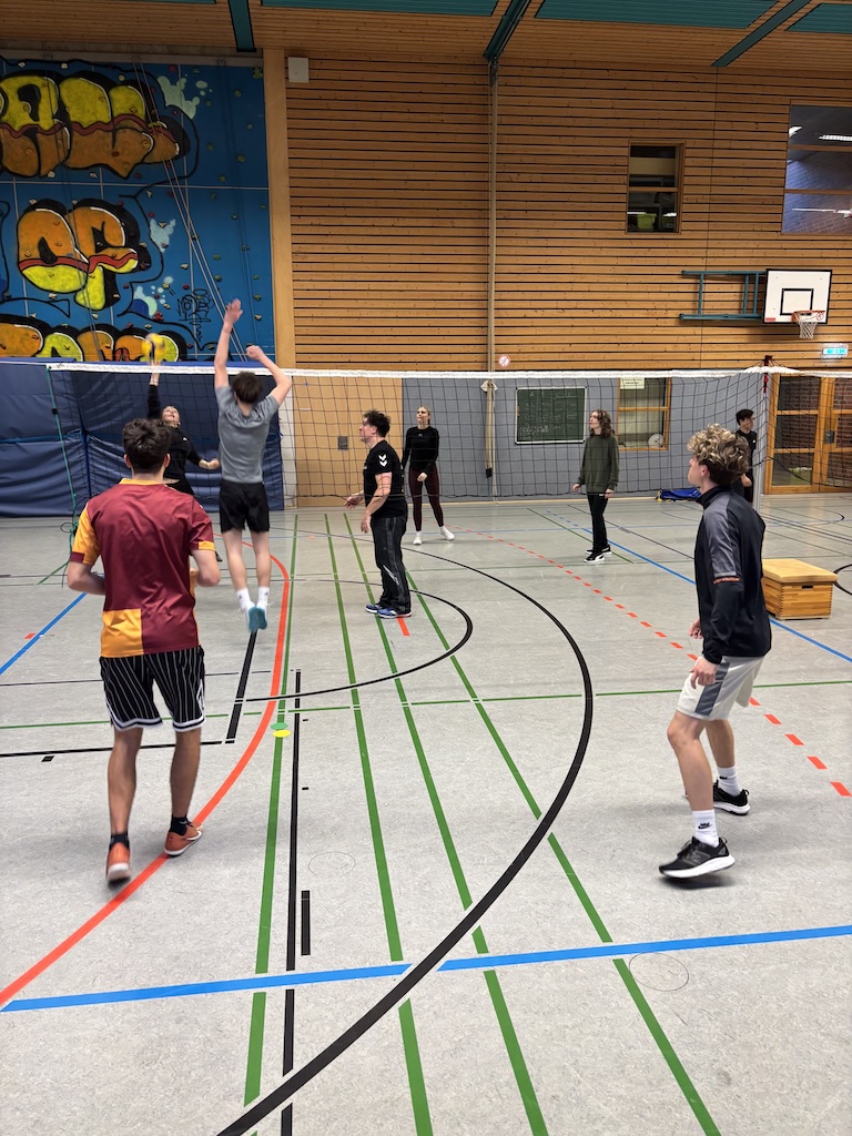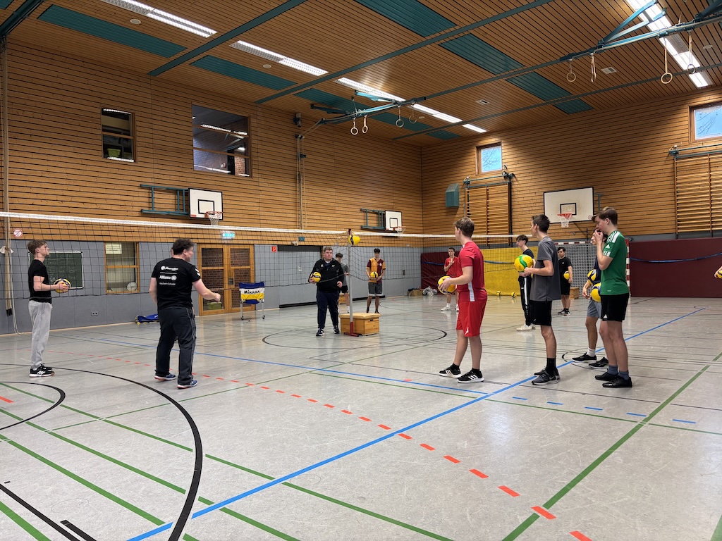 Am 17. Dezember 2025 durften sich die Schülerinnen und Schüler des Sportkurses Q1 von Herrn Klemm über besondere Gäste im Sportunterricht freuen. Nach mehreren Wochen der Wiederholung und Vertiefung der Grundschläge im Volleyball übernahmen nun mit Stefan Maschke (Volleyball-Akademie Düren) und Till Teucher (Teammanager der SWD Powervolleys Düren) zwei Experten den Abschluss der Unterrichtsreihe mit dem besonderen Fokus auf dem taktischen Verhalten im Zusammenspiel auf dem Volleyballfeld.